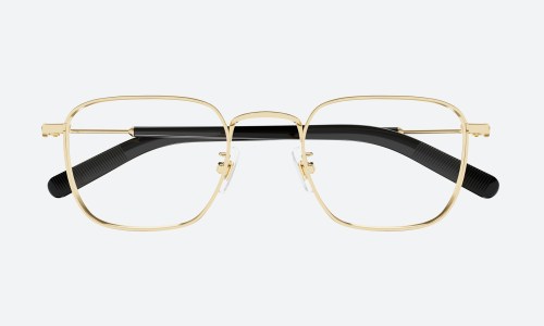 Mont Blanc MB0369O 001 eyeglasses in polished gold metal showcase a sleek rectangular design. Medium-sized and unisex, they combine Mont Blanc’s legendary craftsmanship with timeless elegance for a truly refined eyewear experience.