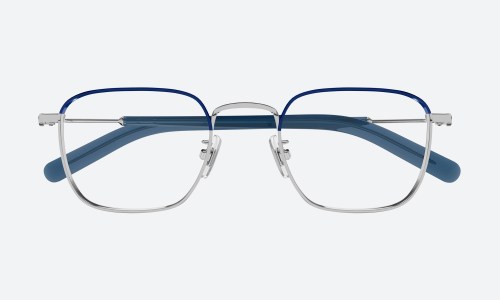 Mont Blanc MB0389O 009 eyeglasses feature a two-tone blue metal frame with a sleek rectangular design. Medium-sized and unisex, they combine contemporary elegance with Mont Blanc’s signature craftsmanship for timeless luxury.