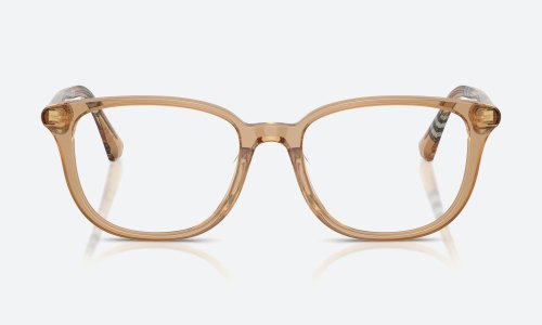 Burberry BE2434D frames in transparent brown acetate offer timeless elegance. These medium-sized, full-rim square spectacle frames for women showcase Burberry’s impeccable craftsmanship and contemporary sophistication.