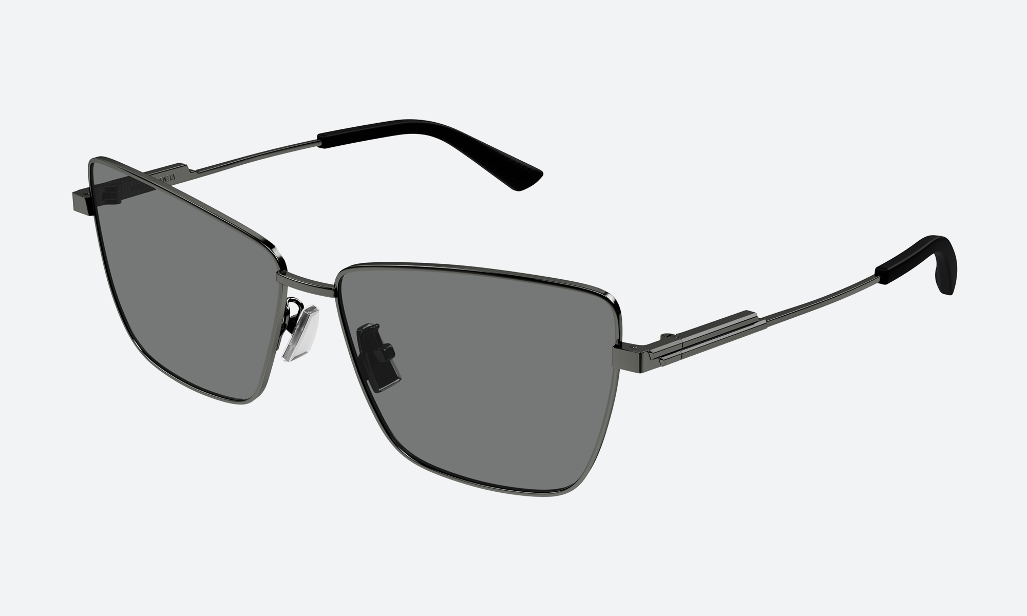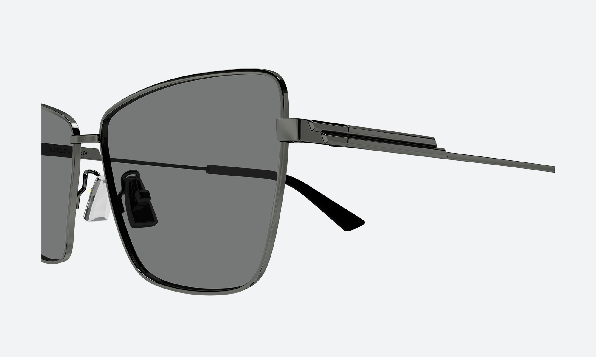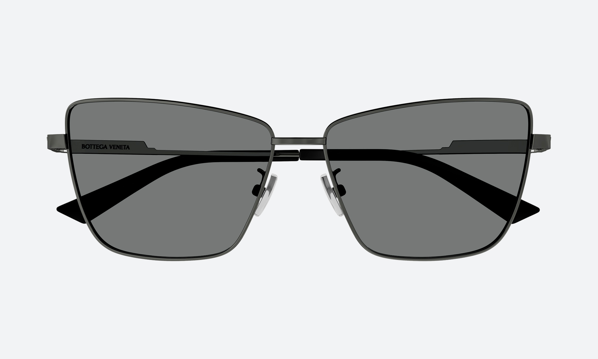 Embrace bold femininity with the Bottega Veneta BV1195S 001 sunglasses. Crafted from polished gunmetal, these extra-large full-rim cat-eye frames exude elegance and sophistication. The sleek metal design enhances any look, making it a statement accessory for modern women.