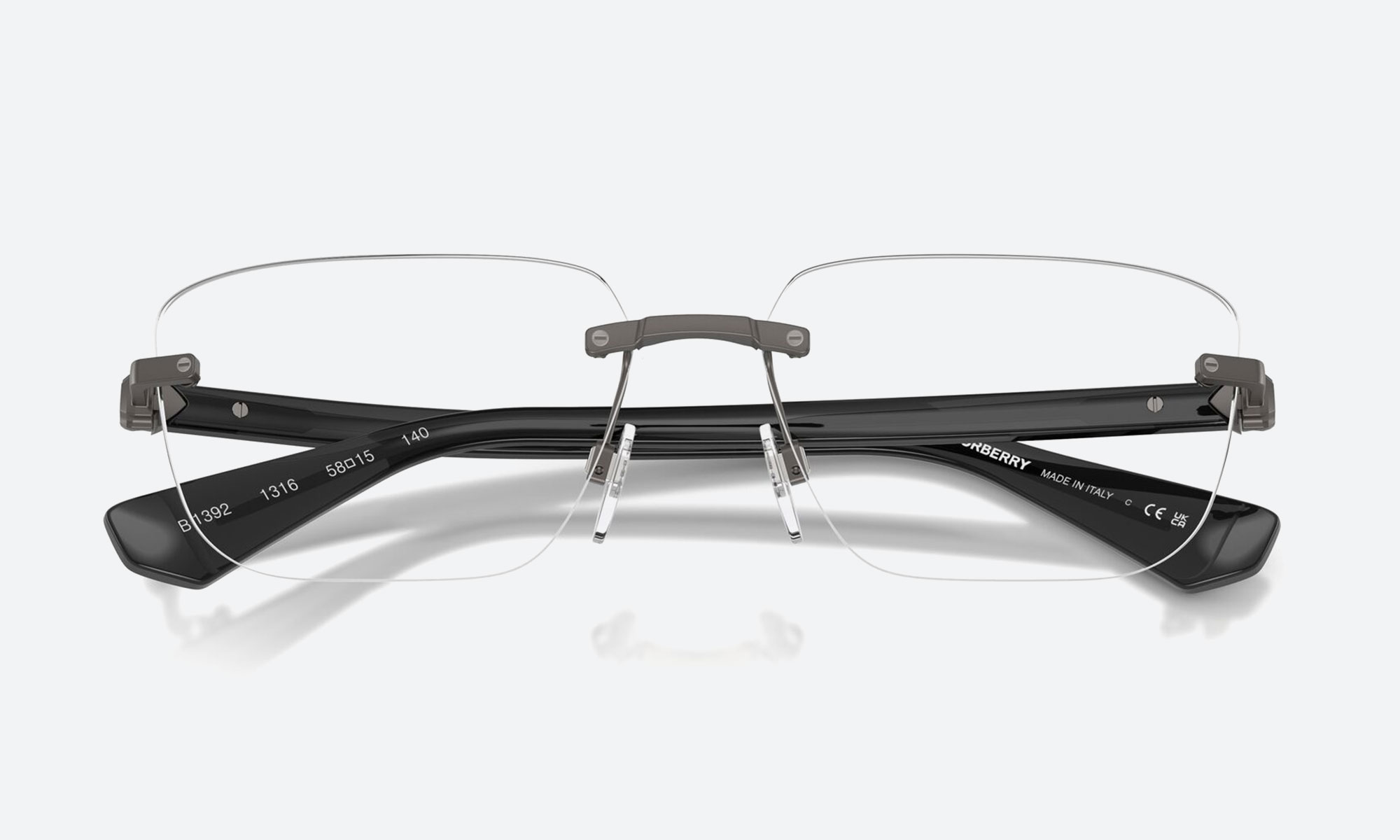 Burberry BE1392 spectacle frames showcase a rimless rectangular design in matte grey metal. These large unisex optical frames offer lightweight comfort and a sleek, modern aesthetic for everyday sophistication.
