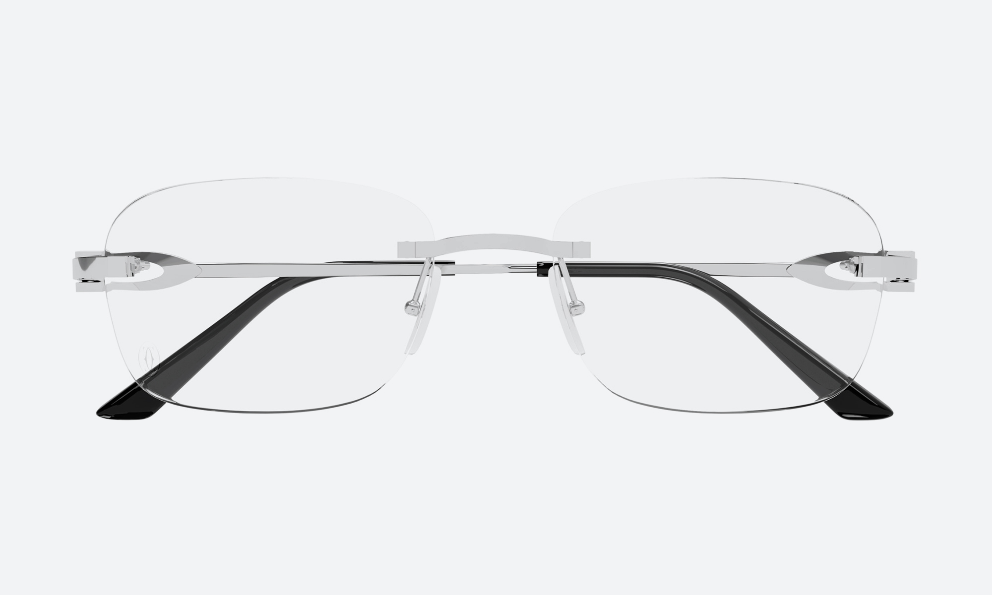 The Cartier CT0290O 004 Silver features a rimless rectangular design in polished silver metal. Offering a sleek, minimalist aesthetic, this eyewear is perfect for those seeking elegance and comfort in one frame.
