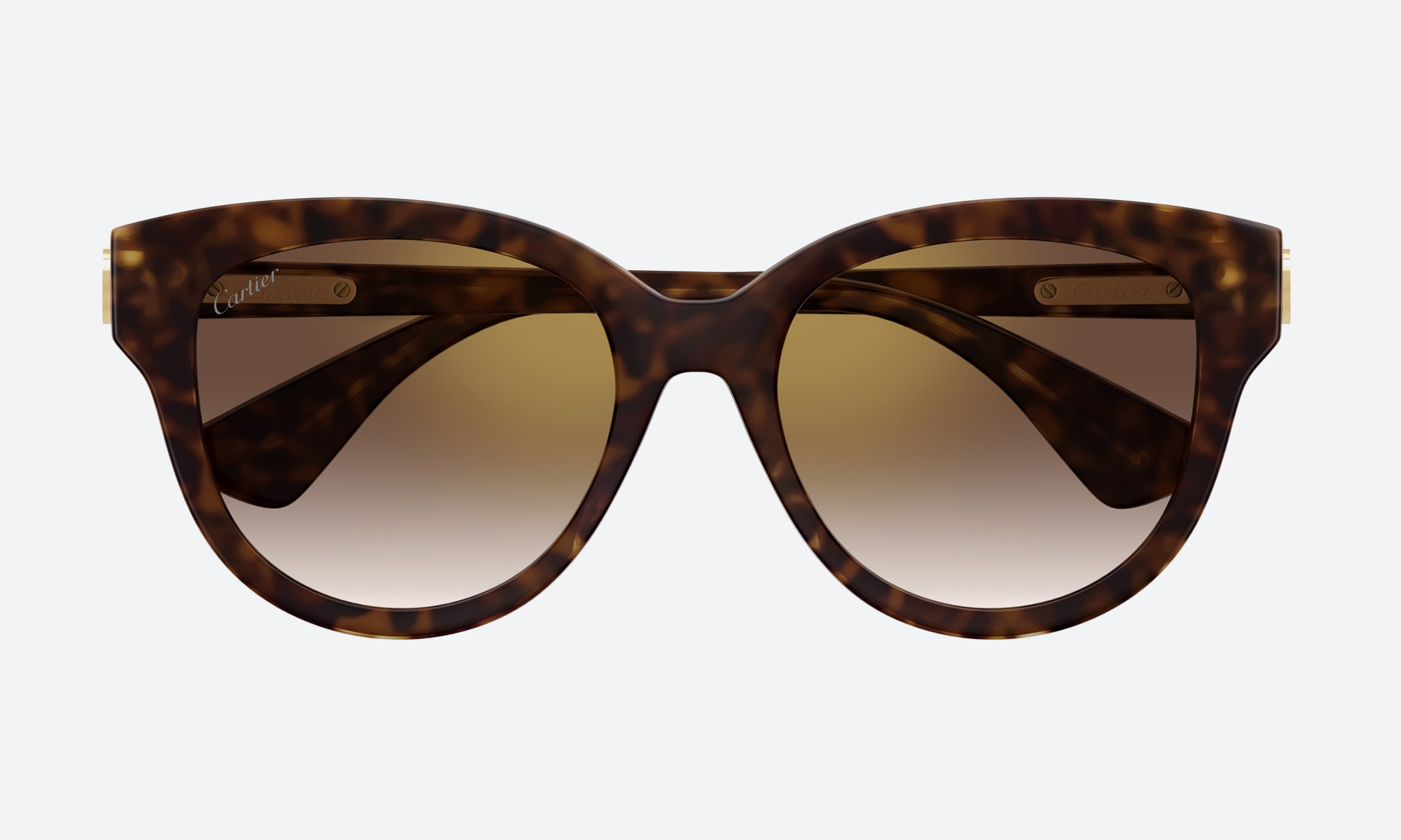 Cartier CT0506S 002 Havana sunglasses feature large, polished acetate frames, gradient brown lenses, and a chic round design, offering UV protection with timeless sophistication for discerning women.