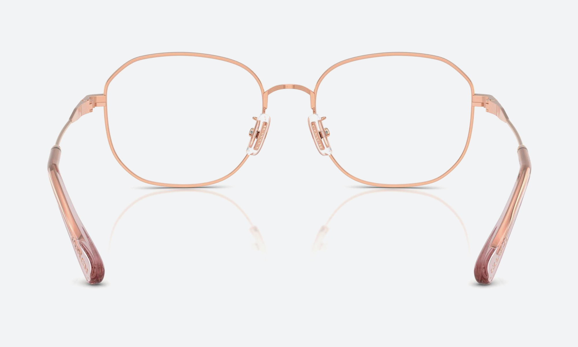 Coach HC5187D rose gold frames showcase polished metal with rounded edges—medium fit, full-rim design offering comfortable, elegant luxury for women seeking timeless and versatile eye.