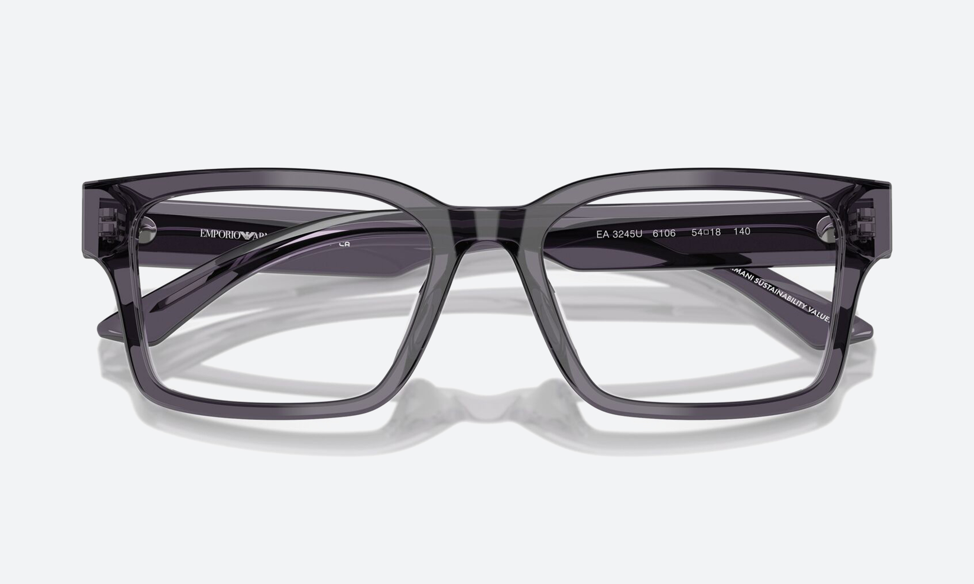 Emporio Armani EA3245U 6106, designed for women, showcases a medium-sized rectangular frame in transparent grey acetate. This full-rim eyewear offers timeless elegance and modern sophistication for any occasion.