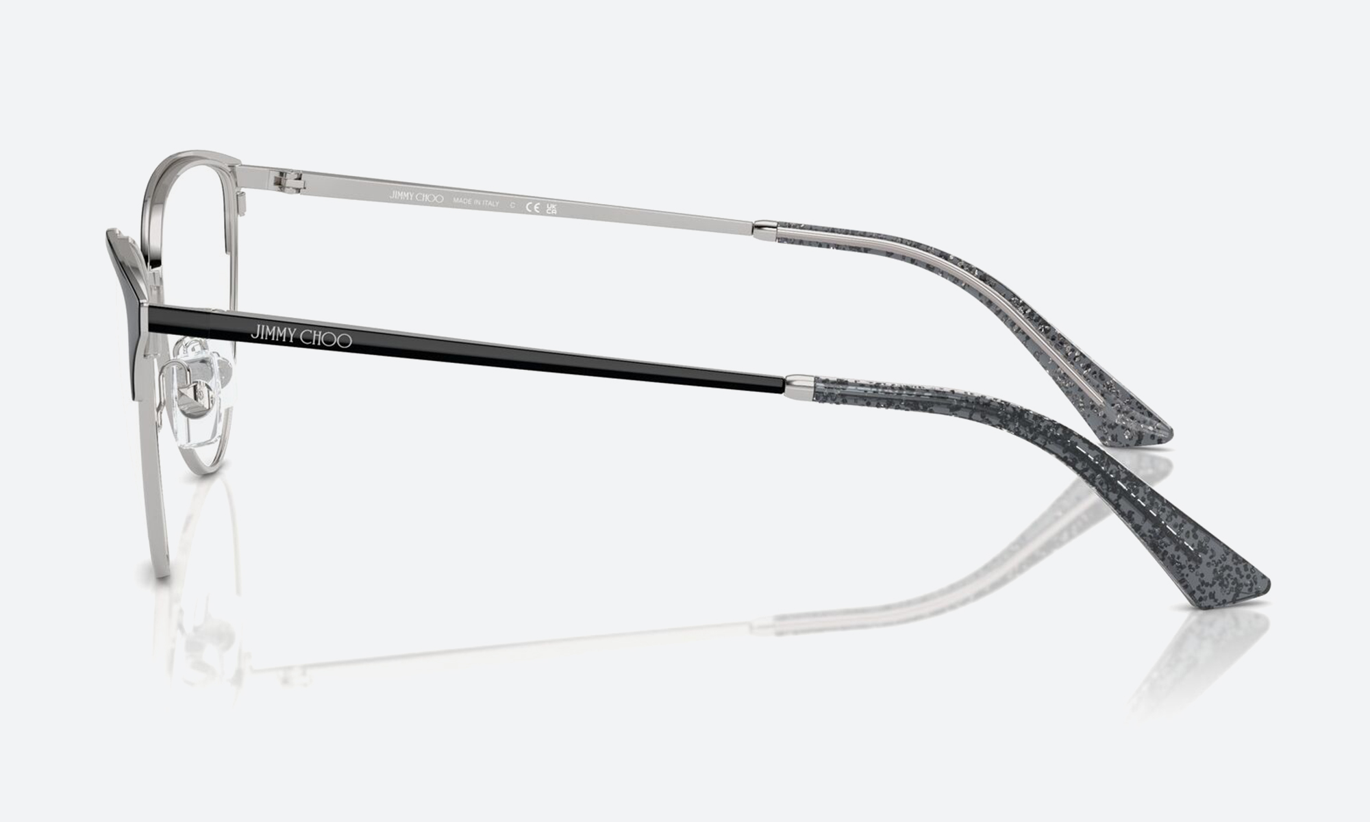 Elevate your elegance with Jimmy Choo JC2002 3016 Black eyeglasses. Crafted from premium two-tone metal, these medium full-rim cateye frames exude sophistication and embody luxury with every detail.